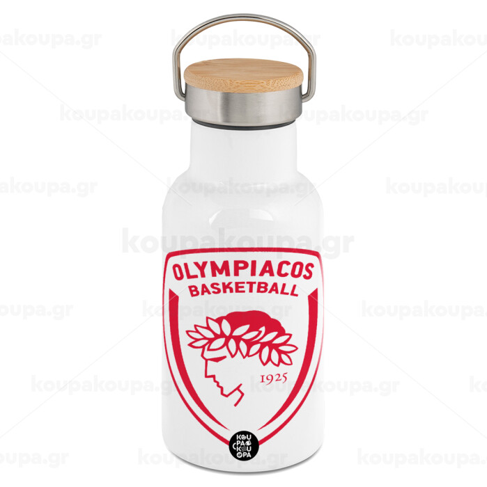 Olympiacos B.C., Metallic thermos (Stainless steel) White with wooden lid (bamboo), double-walled, 350ml