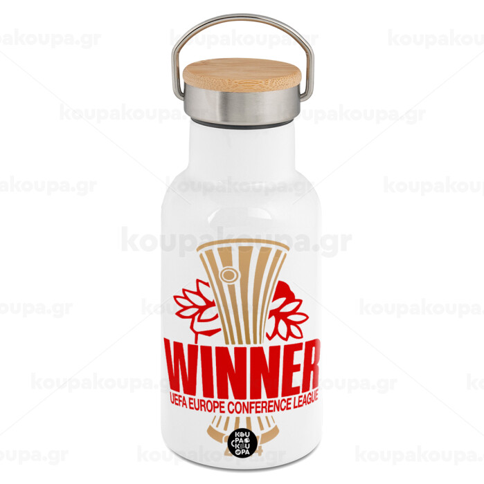 Europa Conference League WINNER, Metallic thermos (Stainless steel) White with wooden lid (bamboo), double-walled, 350ml