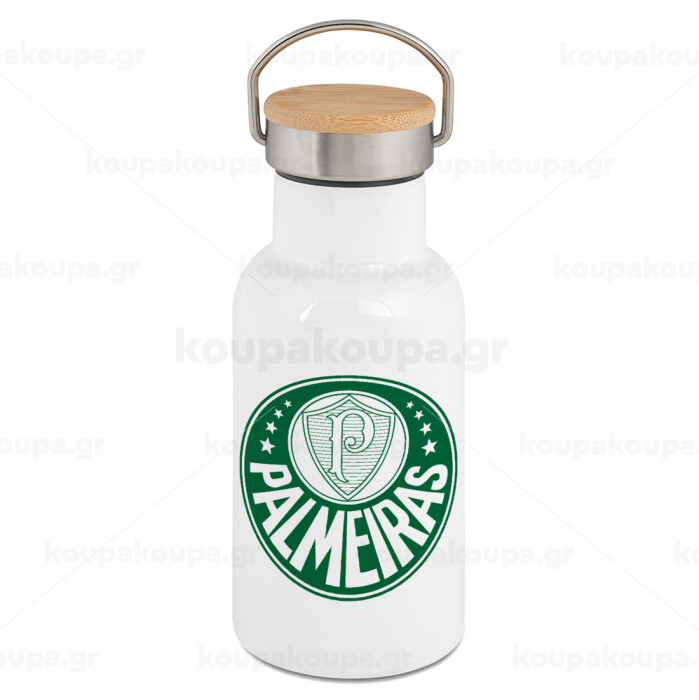 Palmeiras, Metallic thermos (Stainless steel) White with wooden lid (bamboo), double-walled, 350ml