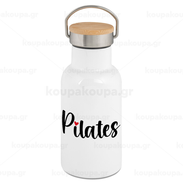 Pilates love, Metallic thermos (Stainless steel) White with wooden lid (bamboo), double-walled, 350ml