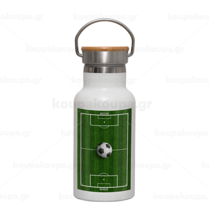 Soccer field, Γήπεδο ποδοσφαίρου, Metallic thermos (Stainless steel) White with wooden lid (bamboo), double-walled, 350ml