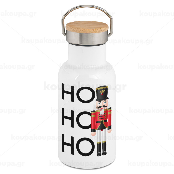 Nutcracker, Metallic thermos (Stainless steel) White with wooden lid (bamboo), double-walled, 350ml