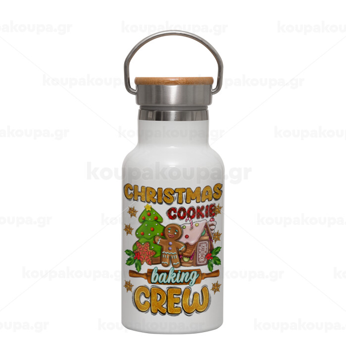 Christmas Cookie Baking Crew, Metallic thermos (Stainless steel) White with wooden lid (bamboo), double-walled, 350ml