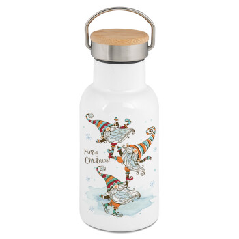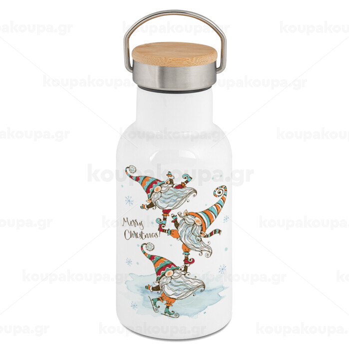 Christmas nordic gnomes, Metallic thermos (Stainless steel) White with wooden lid (bamboo), double-walled, 350ml