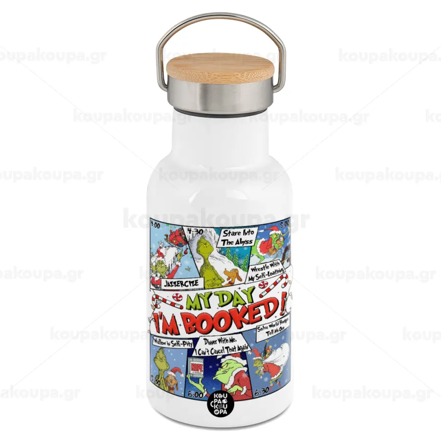 My Day Grinch, Metallic thermos (Stainless steel) White with wooden lid (bamboo), double-walled, 350ml