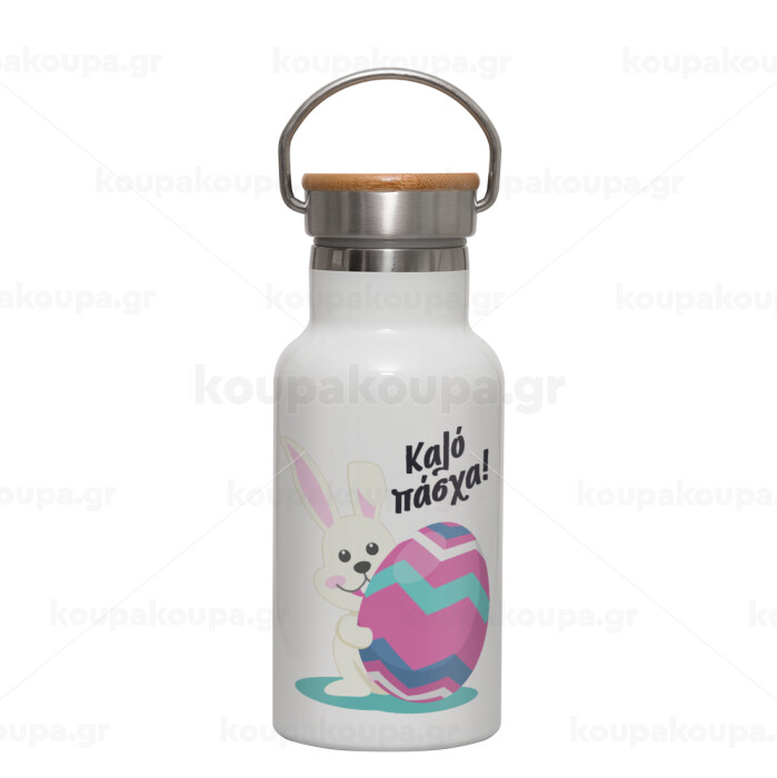 Καλό πάσχα, Metallic thermos (Stainless steel) White with wooden lid (bamboo), double-walled, 350ml