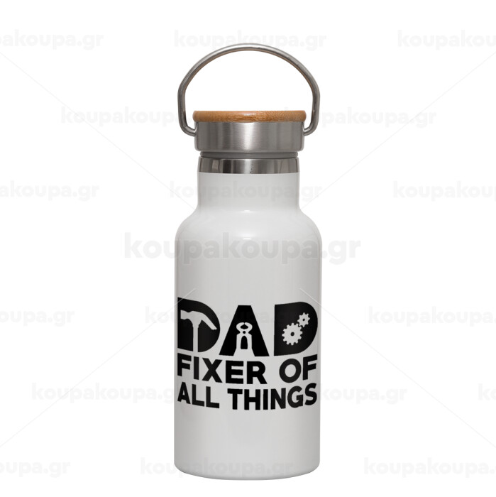 DAD, fixer of all thinks, Metallic thermos (Stainless steel) White with wooden lid (bamboo), double-walled, 350ml