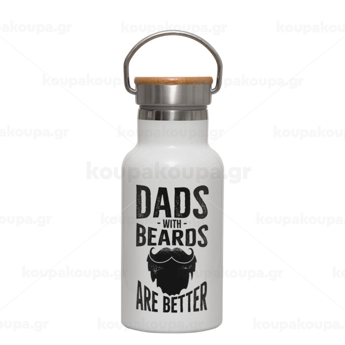 Dad's with beards are better, Metallic thermos (Stainless steel) White with wooden lid (bamboo), double-walled, 350ml