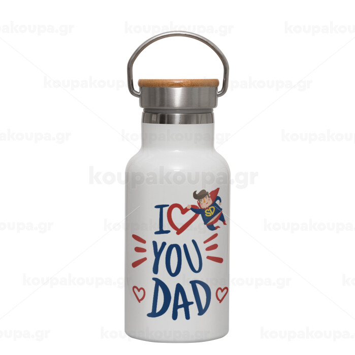 Super Dad, Metallic thermos (Stainless steel) White with wooden lid (bamboo), double-walled, 350ml
