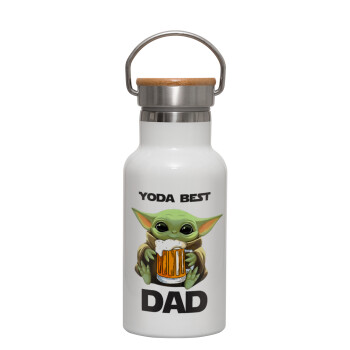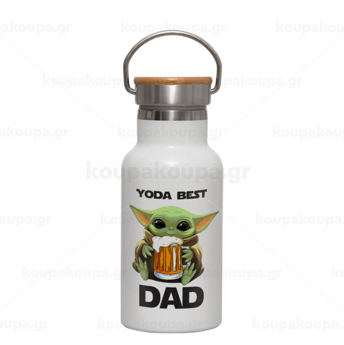 Yoda Best Dad, Metallic thermos (Stainless steel) White with wooden lid (bamboo), double-walled, 350ml
