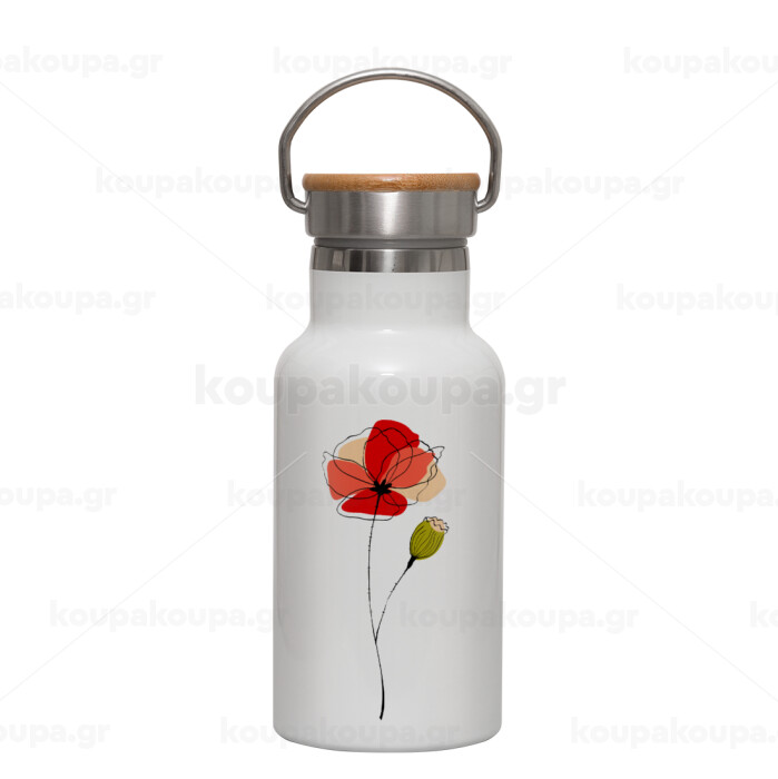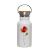 Red poppy flowers papaver, Metallic thermos (Stainless steel) White with wooden lid (bamboo), double-walled, 350ml