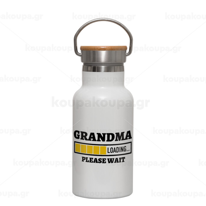 Grandma Loading, Metallic thermos (Stainless steel) White with wooden lid (bamboo), double-walled, 350ml