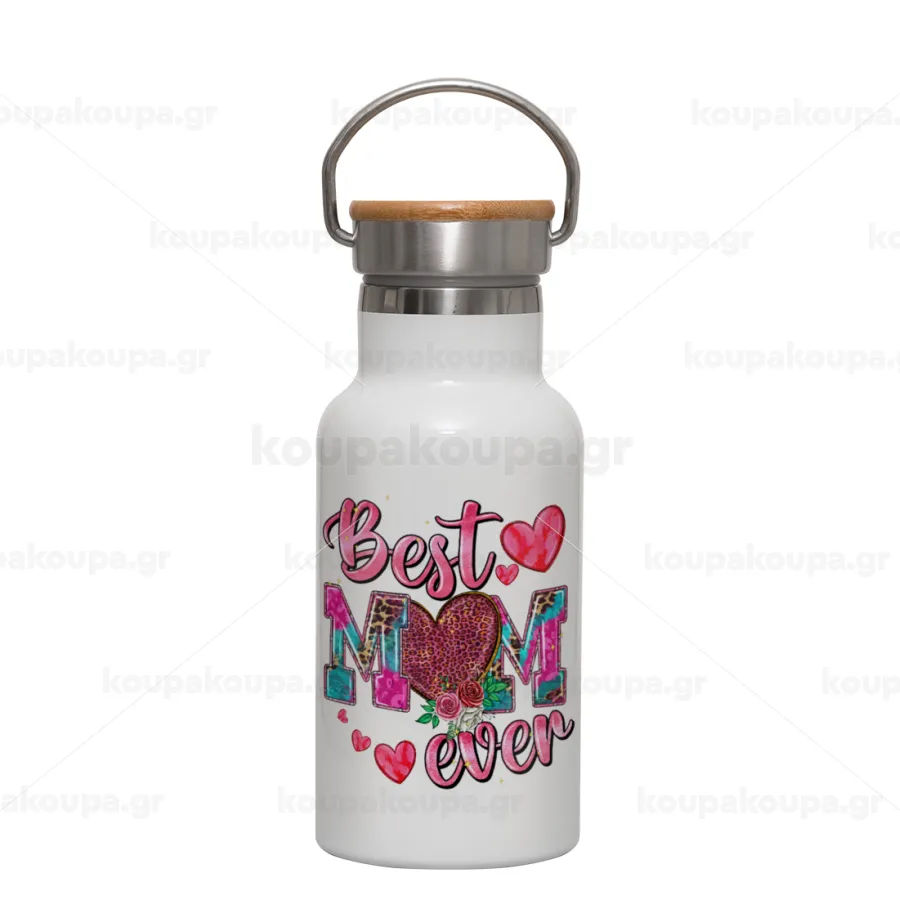 Best mom ever Mother's Day pink, Metallic thermos (Stainless steel) White with wooden lid (bamboo), double-walled, 350ml