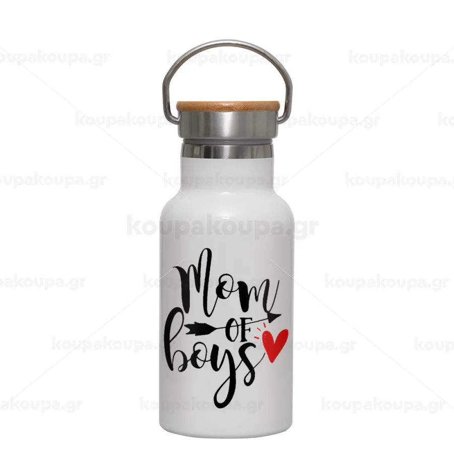 Mom of boys, Metallic thermos (Stainless steel) White with wooden lid (bamboo), double-walled, 350ml