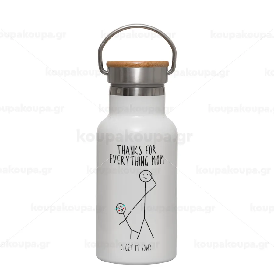 Thanks for everything mom, Metallic thermos (Stainless steel) White with wooden lid (bamboo), double-walled, 350ml
