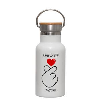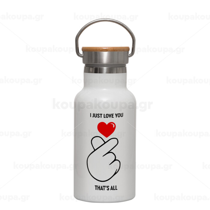 I just love you, that's all., Metallic thermos (Stainless steel) White with wooden lid (bamboo), double-walled, 350ml