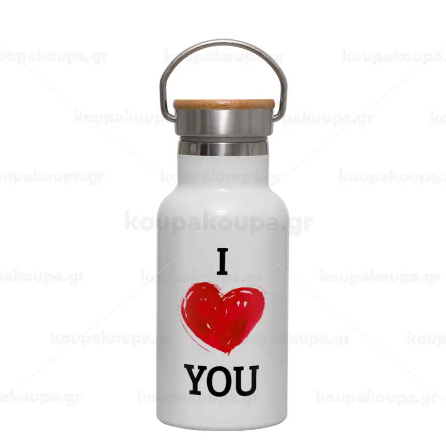 I Love You, Metallic thermos (Stainless steel) White with wooden lid (bamboo), double-walled, 350ml