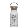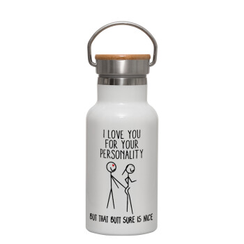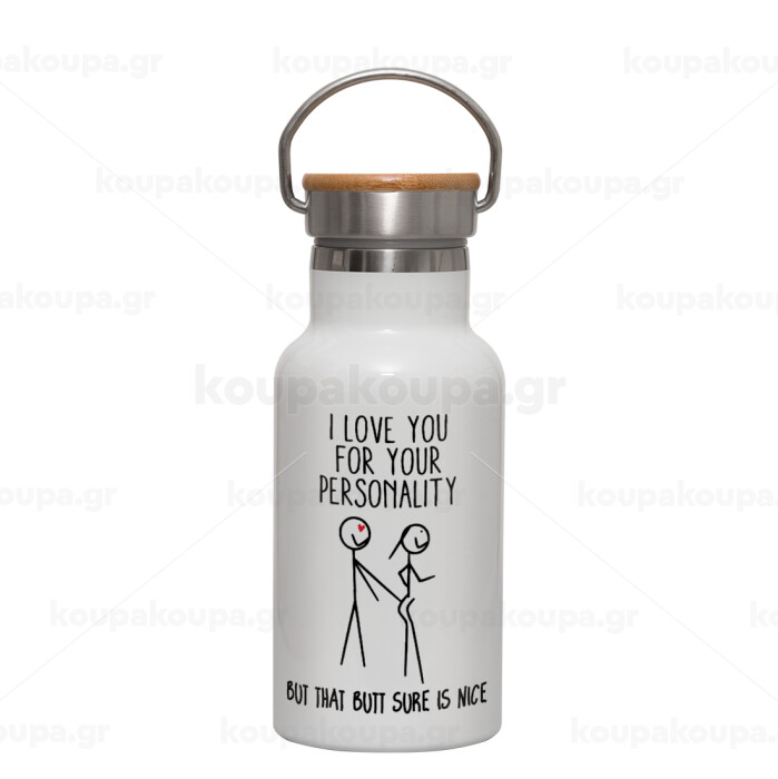 I Love you for your personality, Metallic thermos (Stainless steel) White with wooden lid (bamboo), double-walled, 350ml