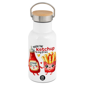 Ketchup To My Fries, Metallic thermos (Stainless steel) White with wooden lid (bamboo), double-walled, 350ml