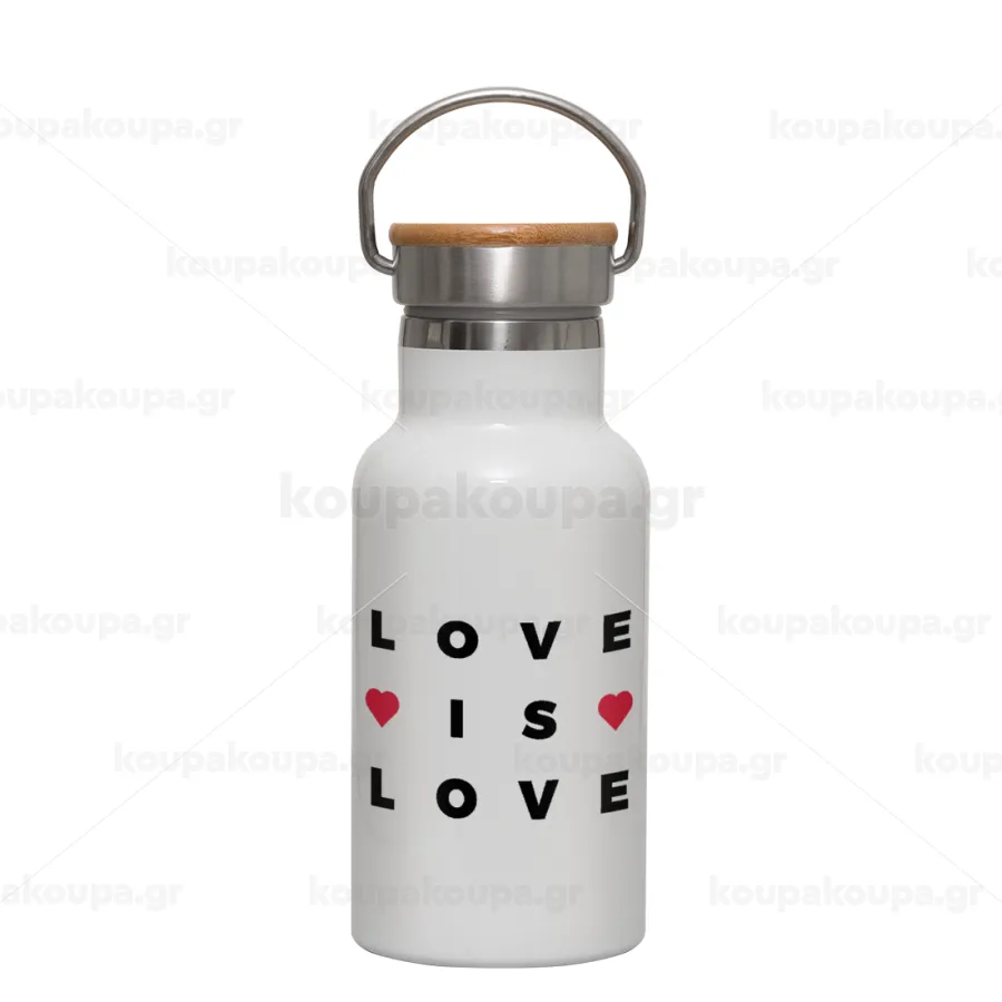 Love is Love, Metallic thermos (Stainless steel) White with wooden lid (bamboo), double-walled, 350ml