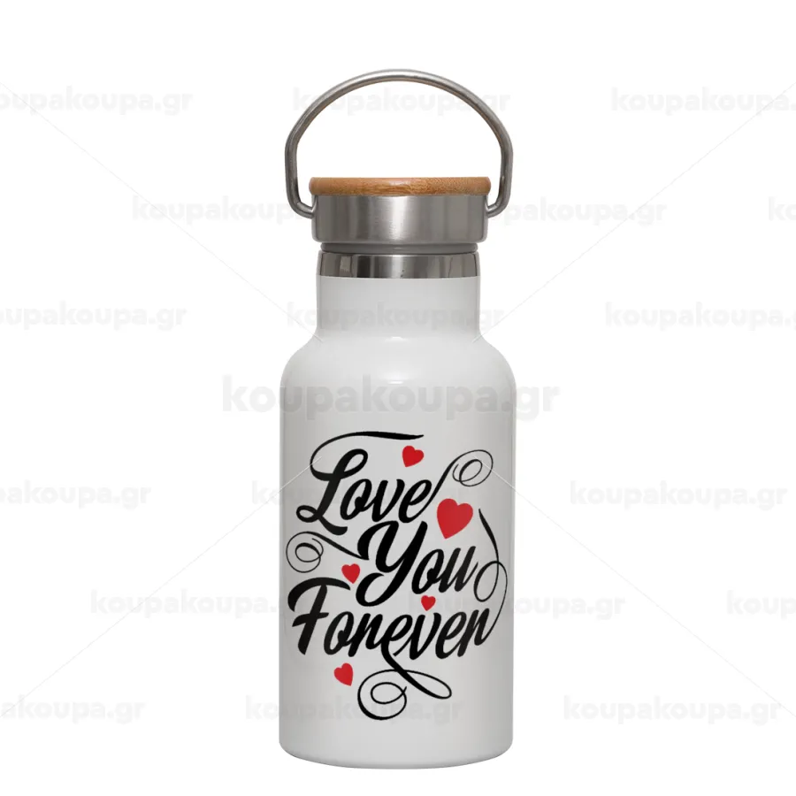 Love you forever, Metallic thermos (Stainless steel) White with wooden lid (bamboo), double-walled, 350ml