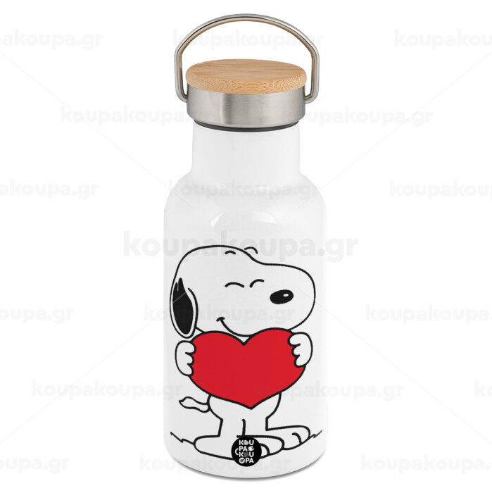 Snoopy takemy heart, Metallic thermos (Stainless steel) White with wooden lid (bamboo), double-walled, 350ml