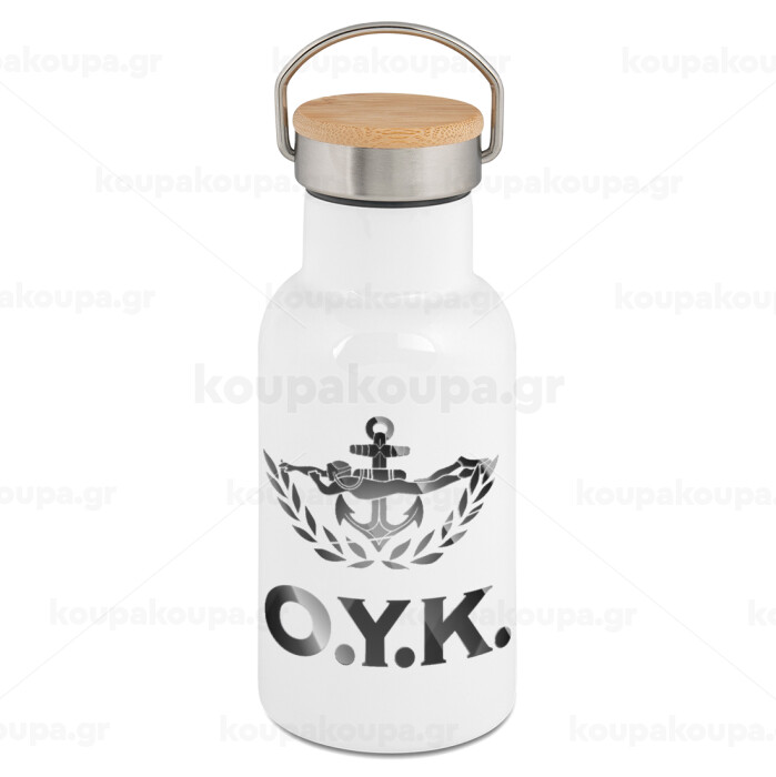 Ο.Υ.Κ., Metallic thermos (Stainless steel) White with wooden lid (bamboo), double-walled, 350ml