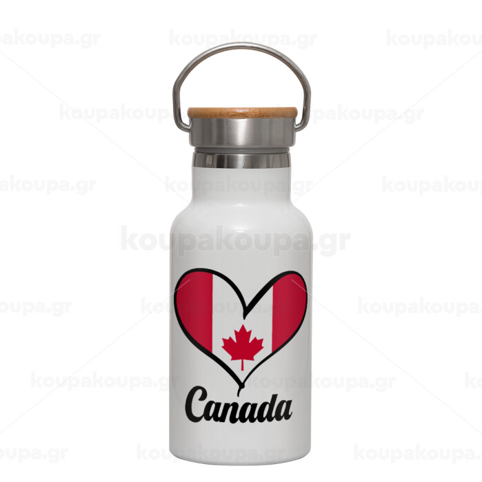 Canada flag, Metallic thermos (Stainless steel) White with wooden lid (bamboo), double-walled, 350ml