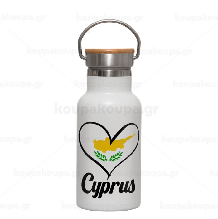 Cyprus flag, Metallic thermos (Stainless steel) White with wooden lid (bamboo), double-walled, 350ml