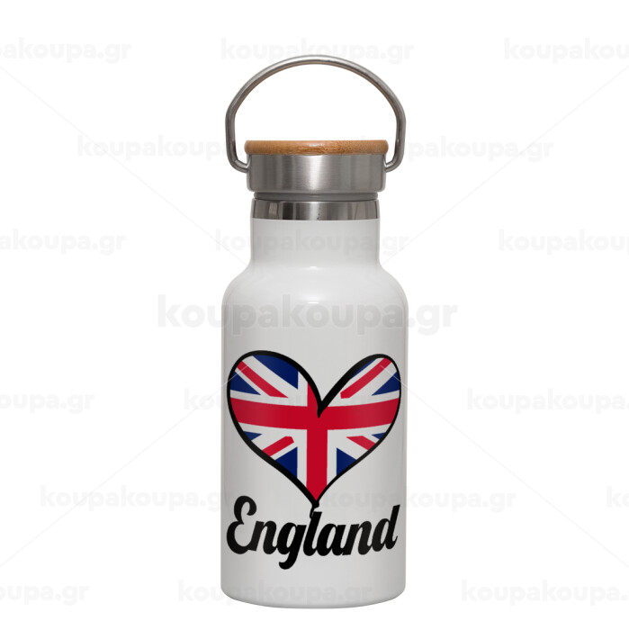 England flag, Metallic thermos (Stainless steel) White with wooden lid (bamboo), double-walled, 350ml