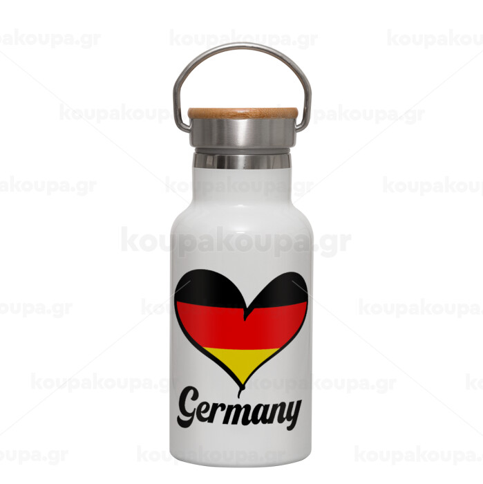 Germany flag, Metallic thermos (Stainless steel) White with wooden lid (bamboo), double-walled, 350ml
