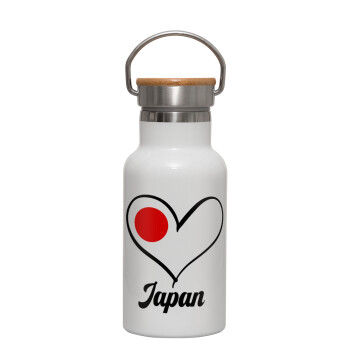 Japan flag, Metallic thermos (Stainless steel) White with wooden lid (bamboo), double-walled, 350ml