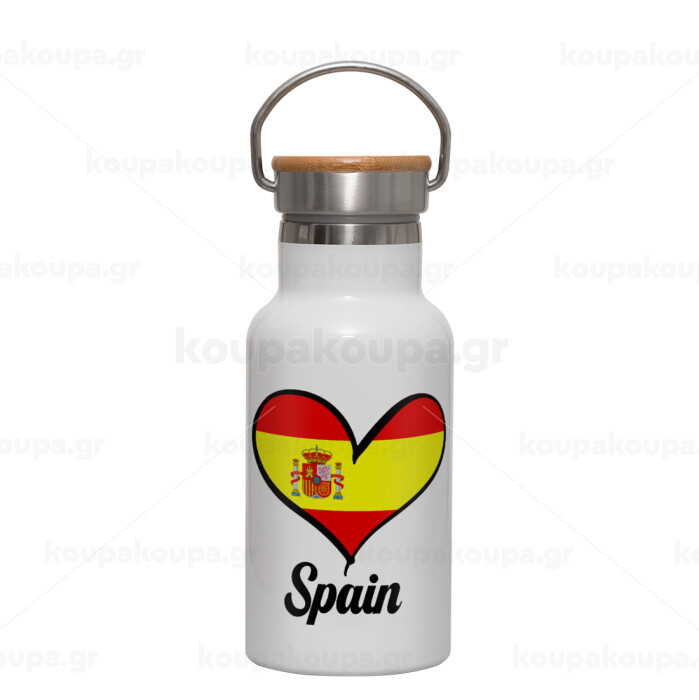Spain flag, Metallic thermos (Stainless steel) White with wooden lid (bamboo), double-walled, 350ml
