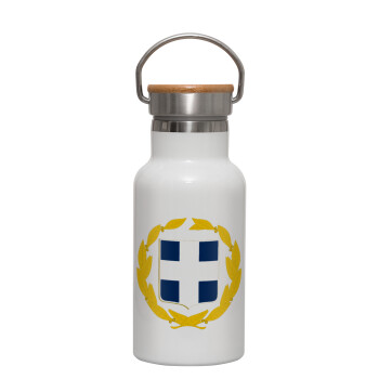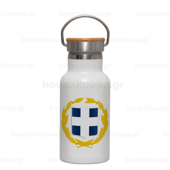 Hellas Εθνόσημο, Metallic thermos (Stainless steel) White with wooden lid (bamboo), double-walled, 350ml
