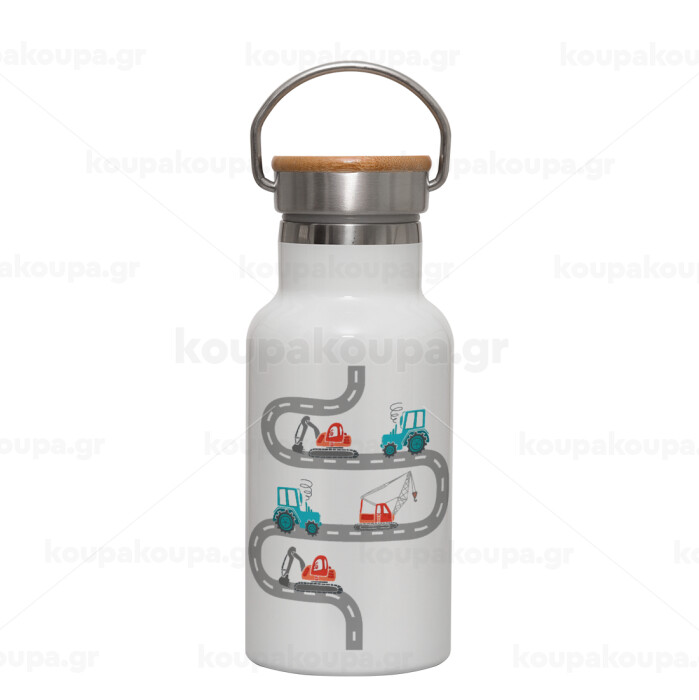 excavator along road, Metallic thermos (Stainless steel) White with wooden lid (bamboo), double-walled, 350ml