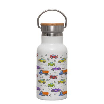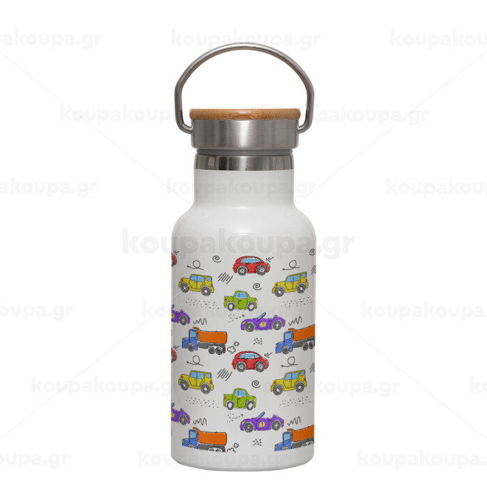 Colorful cars, Metallic thermos (Stainless steel) White with wooden lid (bamboo), double-walled, 350ml