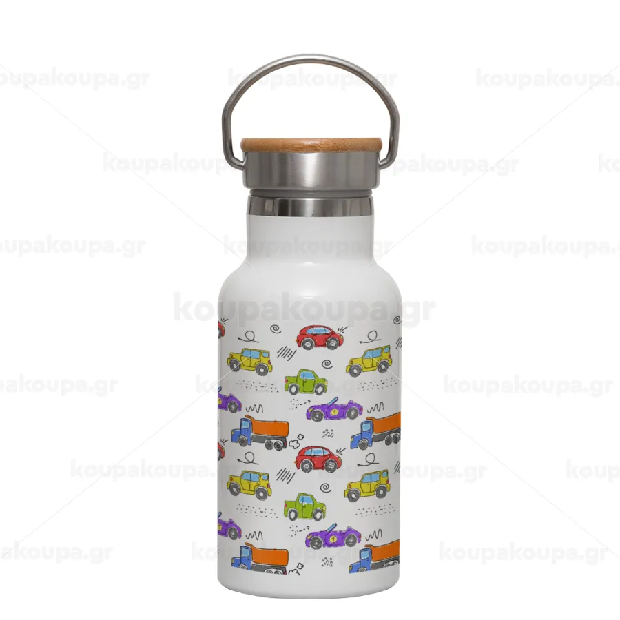 Colorful cars, Metallic thermos (Stainless steel) White with wooden lid (bamboo), double-walled, 350ml