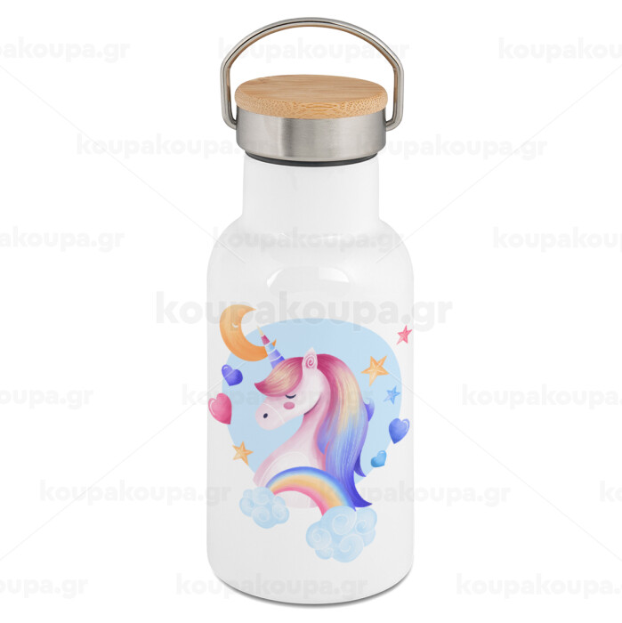Cute unicorn, Metallic thermos (Stainless steel) White with wooden lid (bamboo), double-walled, 350ml
