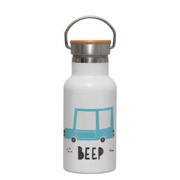 Car BEEP..., Metallic thermos (Stainless steel) White with wooden lid (bamboo), double-walled, 350ml