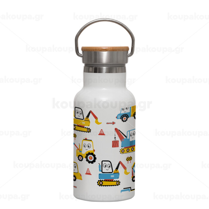 Hand drawing building truck, Metallic thermos (Stainless steel) White with wooden lid (bamboo), double-walled, 350ml