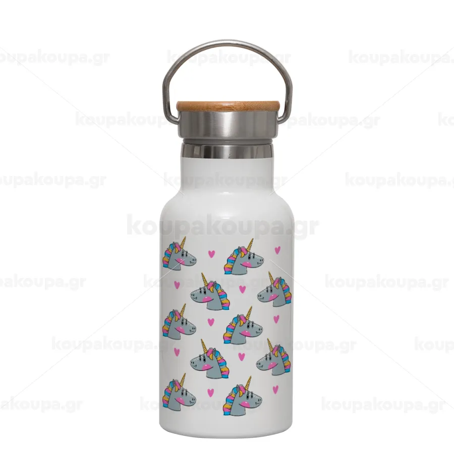 Unicorn, Metallic thermos (Stainless steel) White with wooden lid (bamboo), double-walled, 350ml