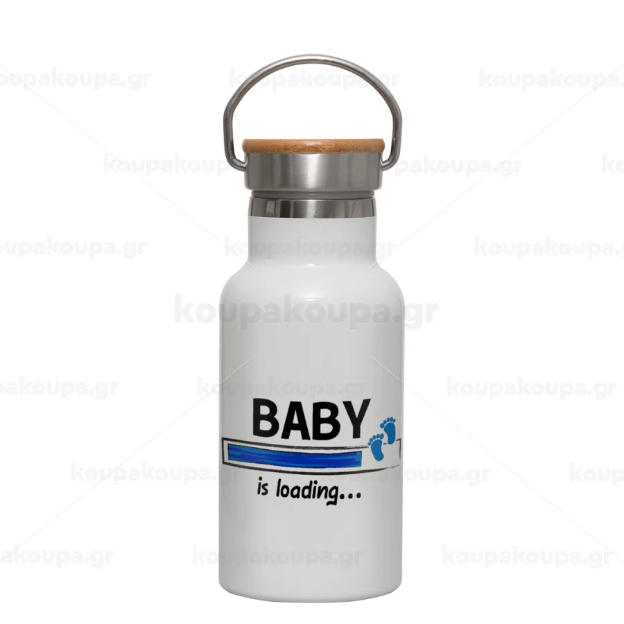 Baby is Loading BOY, Metallic thermos (Stainless steel) White with wooden lid (bamboo), double-walled, 350ml