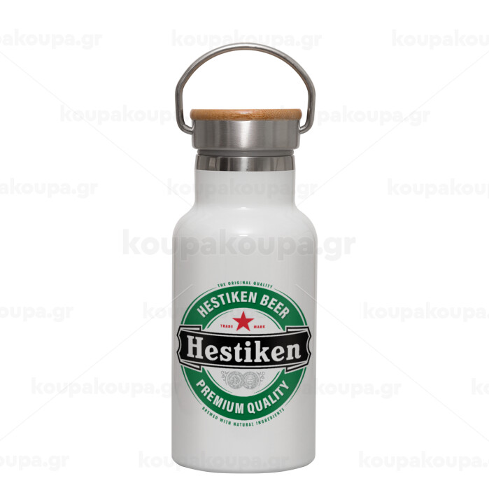Hestiken Beer, Metallic thermos (Stainless steel) White with wooden lid (bamboo), double-walled, 350ml