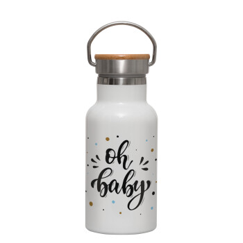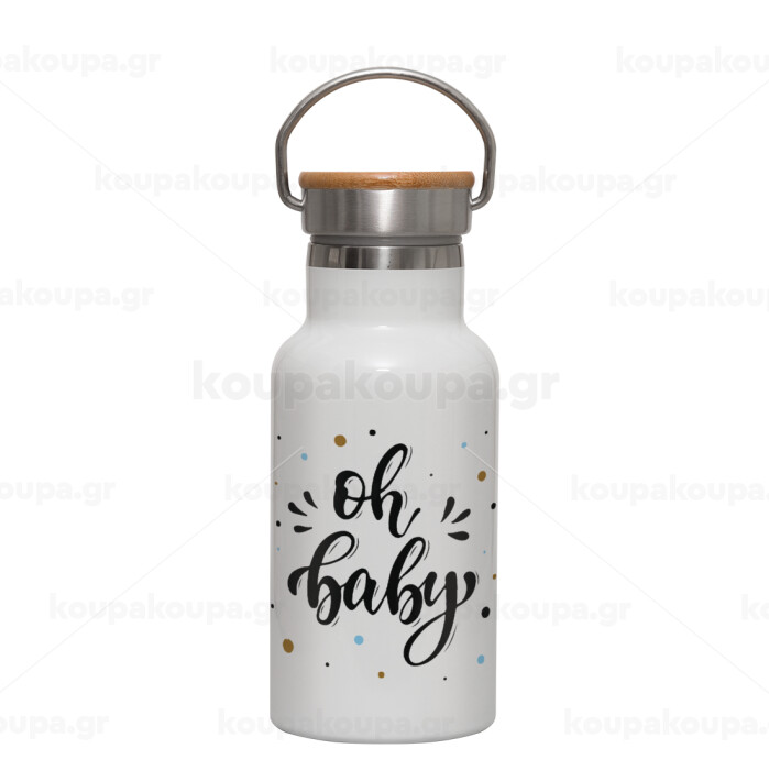 Oh baby, Metallic thermos (Stainless steel) White with wooden lid (bamboo), double-walled, 350ml