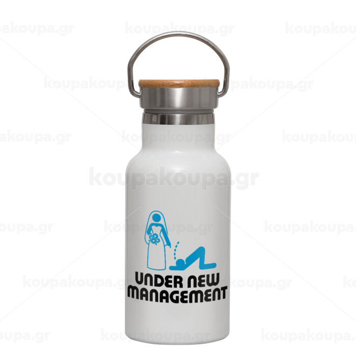 Under new Management, Metallic thermos (Stainless steel) White with wooden lid (bamboo), double-walled, 350ml