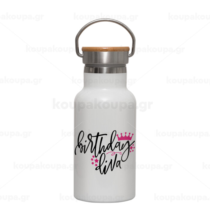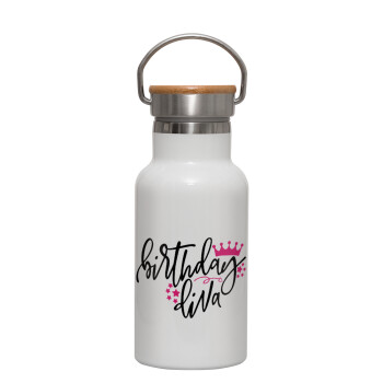 Birthday Diva queen, Metallic thermos (Stainless steel) White with wooden lid (bamboo), double-walled, 350ml