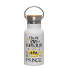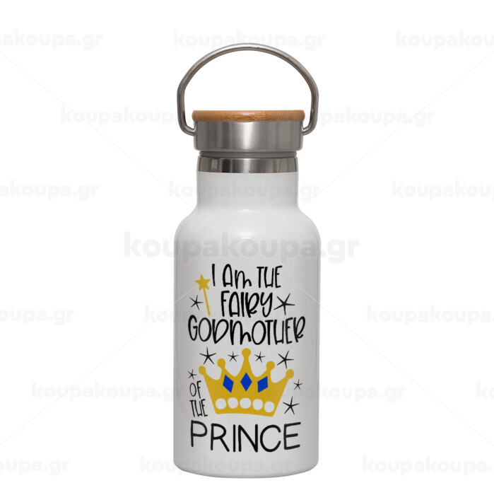 I am the fairy Godmother of the Prince, Metallic thermos (Stainless steel) White with wooden lid (bamboo), double-walled, 350ml