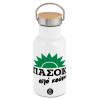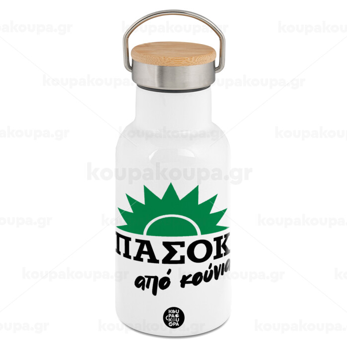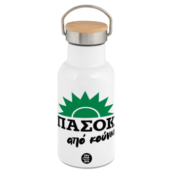 ΠΑΣΟΚ από κούνια, Metallic thermos (Stainless steel) White with wooden lid (bamboo), double-walled, 350ml