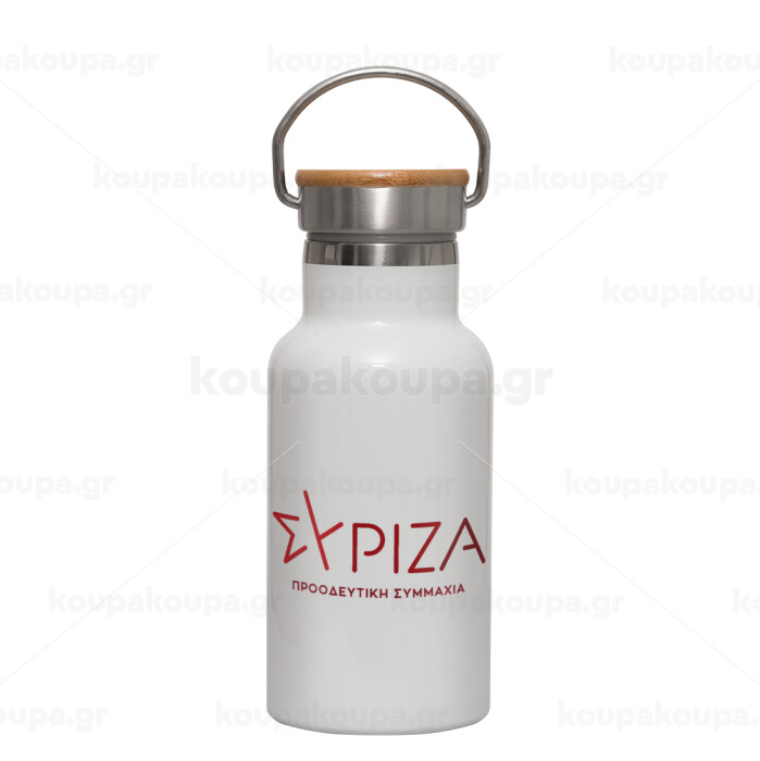 Σύριζα το νέο, Metallic thermos (Stainless steel) White with wooden lid (bamboo), double-walled, 350ml