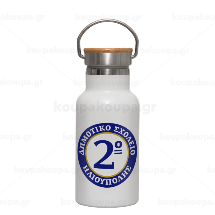 Έμβλημα Σχολικό μπλε/χρυσό, Metallic thermos (Stainless steel) White with wooden lid (bamboo), double-walled, 350ml